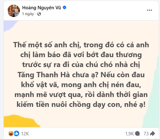 Ngay sau khi Tăng Thanh Hà chia sẻ tin buồn, nhiều bạn bè, đồng nghiệp trong giới giải trí đã để lại lời chia buồn và động viên. Ca sĩ Lệ Quyên là một trong những người lên tiếng, nhắc lại kỷ niệm về thời điểm vợ chồng Tăng Thanh Hà nuôi hai chú chó trước khi có các con. Lời chia sẻ mộc mạc nhưng chân thành của nữ ca sĩ nhận được sự đồng tình từ đông đảo khán giả, bởi nó phản ánh đúng sự gắn bó lâu dài giữa gia đình Tăng Thanh Hà và thú cưng.