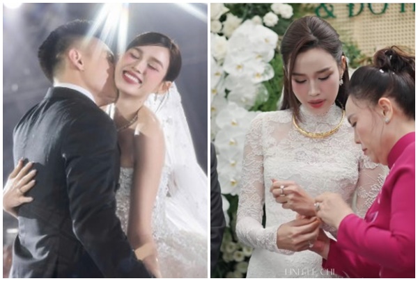 Khoảnh khắc trao nhẫn diễn ra khi ngoài trời mưa nặng hạt. Hoa hậu rưng rưng, còn Viết Vương ân cần đeo nhẫn cho vợ. Thời tiết không thuận lợi nhưng không làm gián đoạn buổi lễ, trái lại khiến giây phút hôn lễ trở nên đáng nhớ, đầy cảm xúc.