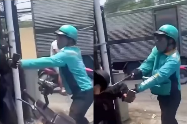 Theo nội dung clip, thời điểm trên, một nam thanh niên mặc áo xe ôm công nghệ khi di chuyển đến giao lộ thì xảy ra mâu thuẫn, cự cãi với hai người đi xe máy. Sau khi lời qua tiếng lại, người này bất ngờ mở cốp xe, lấy ra một cây gậy 3 khúc rồi lao đến tấn công đối phương.