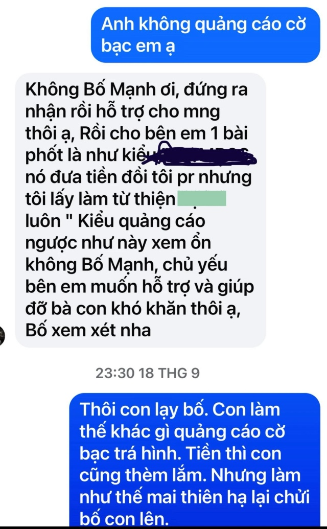 Duy Mạnh công khai tin nhắn một web cờ bạc đề nghị job quảng cáo.