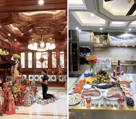 CEO Mailisa cũng chuẩn bị rất nhiều đồ lễ để dâng lên bàn thờ Thần Tài – Thổ Địa của gia đình. Bàn thờ được làm bằng gỗ, có kích thước cao và rộng vượt trội so với các mẫu thông thường, tạo cảm giác uy nghi và sang trọng. Xung quanh được trang trí cẩn thận với nhiều loại hoa đặc trưng như hoa lan, hoa đào, hoa loa kèn, hoa đồng tiền… Lễ vật dâng gồm đầy đủ các món mặn như cá lóc, thịt lợn quay, tôm, trứng, cùng các món ngọt và đồ chay như bánh mứt, kẹo lạc, bánh trôi, xôi gấc. Toàn bộ đều do chính tay vợ chồng Mailisa tự bày biện và sắp xếp, thể hiện sự chỉn chu và lòng thành kính trong từng chi tiết.