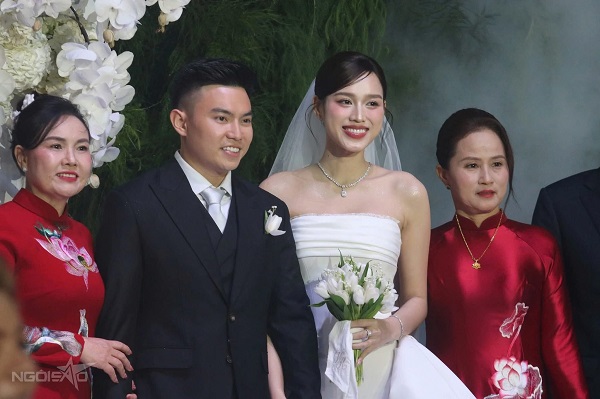 Chú rể Viết Vương đáp lại ngọt ngào: “Cảm ơn em, người con gái đã xuất hiện trong cuộc đời anh và cho anh biết thế nào là tình yêu. Em à, chúng ta hãy cùng nhau cố gắng vì tình yêu này. Không chỉ là những lời nói ngọt ngào mà còn là những khoảnh khắc trôi qua mỗi ngày, tất cả sẽ ngập tràn tình yêu. Hôm nay, sau tất cả những năm tháng chờ đợi, anh đã sẵn sàng bước đến, cầm đôi tay và cùng em đi qua những chặng đời phía trước”.