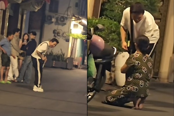 Nam đạo diễn gửi một chút tấm lòng đến một người phụ nữ đang quỳ. Ảnh: Tổng hợp