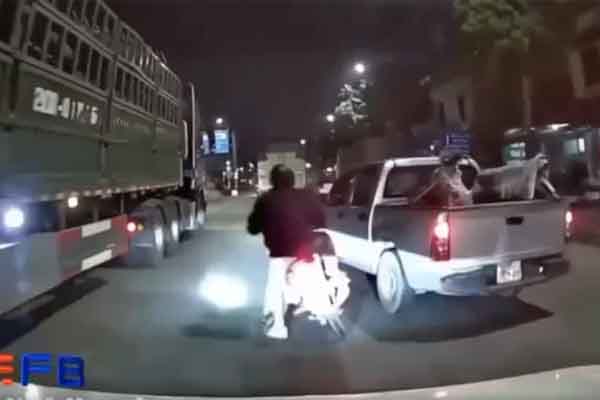 Theo đoạn clip dài 27 giây, sự việc xảy ra lúc 21h15 ngày 27/2. Ôtô bán tải màu ghi xám (chưa rõ biển số) khi đang lưu thông bất ngờ chuyển hướng, khiến xe máy đi cùng chiều ngã xuống đường.