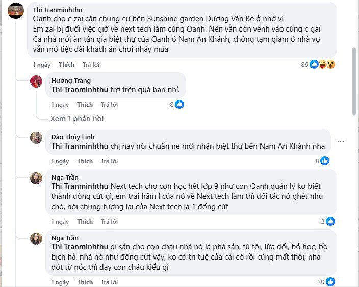 Bên dưới có khá nhiều tài khoản vào xác nhận thông tin trên là đúng, có người còn tiết lộ Phương Oanh chỉ mới học hết lớp 9 nên không đủ trình quản lý, em trai về Next Tech làm cùng bị đối tác ghét bỏ, tương lai Next Tech sẽ sớm lụi tàn.