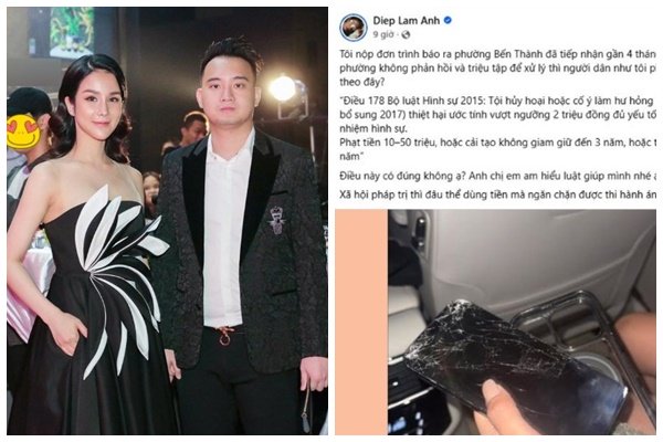 Đáng chú ý, sau khi chồng cũ công khai có tình mới, Diệp Lâm Anh bất ngờ đăng tải trên trang Facebook cá nhân bài viết liên quan đến việc bị phá hoại tài sản là chiếc điện thoại. Diệp Lâm Anh cho biết, cô đã nộp đơn trình báo ra phường Bến Thành gần 4 tháng qua, tuy nhiên chưa được phản hồi. Mặc dù Diệp Lâm Anh không nhắc đích danh tốc cáo sai, song dưới bài viết, rất nhiều người bình luận và nhắc đến chồng cũ của cô.