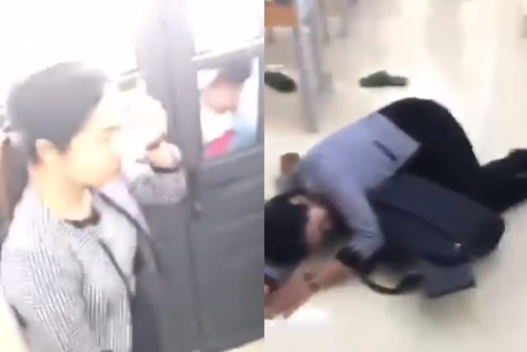 Nữ giáo viên nằm lăn ra sàn lớp học bất động sau khi bị ném dép vào trán (Ảnh cắt từ clip).