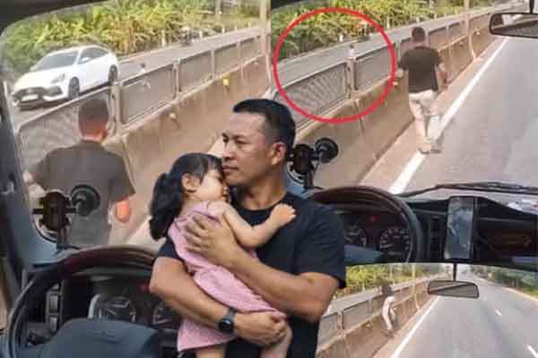 Đang lái xe, phát hiện bé gái đi qua Quốc lộ 1 khá nguy hiểm, nam tài xế đã dừng xe và lao qua bên kia đường bế cháu bé rời khỏi vị trí nguy hiểm.