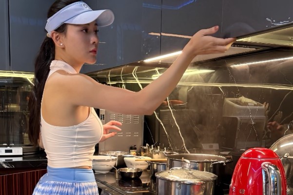 Trên MXH, Phương Oanh thường xuyên chia sẻ những đoạn clip ghi lại khoảnh khắc nấu nướng trong gian bếp sang chảnh, hiện đại.