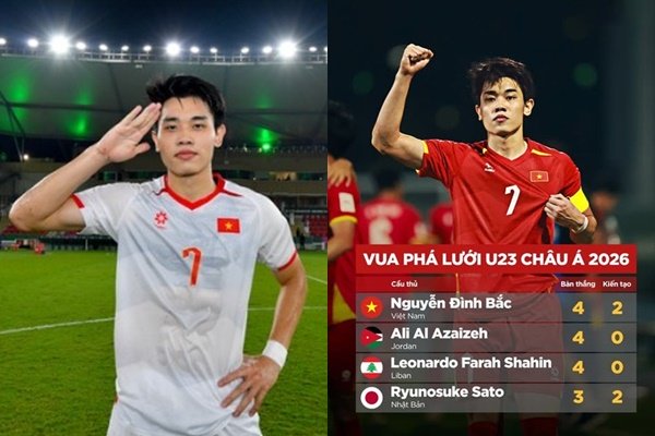 Với pha lập công vào lưới U23 Hàn Quốc, Đình Bắc đã nâng tổng số bàn thắng tại giải U23 châu Á 2026 lên con số 4. Chân sút xứ Nghệ hiện đang dẫu đầu danh sách ghi bàn cùng với Ali Azaizeh (U23 Jordan) và Leonardo Farah Shahin (U23 Lebanon).