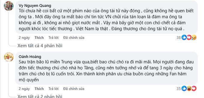 Bên dưới bài đăng dân mạng xót xa cho Thương Tín: ‘Tôi chưa hề coi bất cứ một phim nào của ông tài tử này đóng, đám m:a ông ta không ai đi, không ai nhỏ giọt nước mắt. Vậy mà bây giờ một con ch:ó ch:ết cả đám người khóc lóc tiếc thương, nghĩ mà cay đăng cho ông tài tử nọ quá’