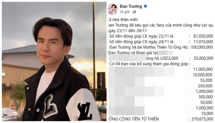 Tối 24/11, ca sĩ Đan Trường đăng tải công khai bản sao kê tài khoản ngân hàng, khẳng định sự minh bạch trong hoạt động quyên góp vừa thực hiện. Tổng số tiền tiếp nhận được là 268 triệu đồng, trong đó anh đóng góp 100 triệu đồng.