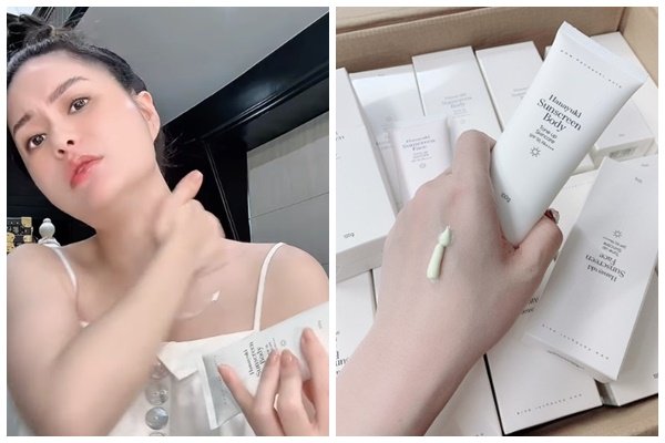 Đoàn Di Băng cho biết phải cắt đôi tuýp kem chống nắng ra, vét phần còn lại để dùng, do bán quá chạy. Ảnh chụp từ video