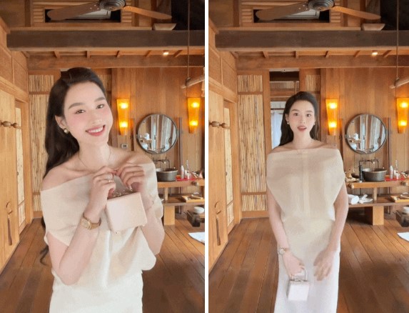 Trong khi đó, nàng dâu hào môn Đỗ Hà lại một lần nữa khiến công chúng dành nhiều lời khen cho gu thẩm mỹ ngày càng tinh tế của mình. Thay vì những thiết kế đầm ngắn khoe trọn đôi chân “trứ danh” từng làm nên thương hiệu, lần này Đỗ Hà lựa chọn một bộ đầm dài thướt tha màu trắng kem.