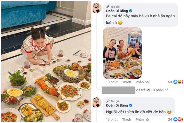 Ở phía dưới bài đăng, Đoàn Di Băng còn liên tục để lại bình luận, cho biết những món như tôm hùm, bào ngư, cua hoàng đế,… thì các bà vú ở nhà mình cũng đã ăn ngán rồi.