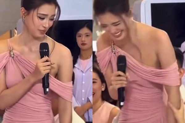 Hoa hậu Tiểu Vy phải “cầu cứu” Thiều Bảo Trâm khi được mời phát biểu ở sự kiện (Nguồn: @8chuyenshowbiz)