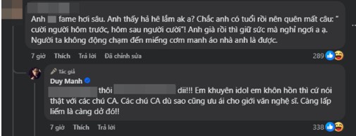 Đáp trả bình luận của một cư dân mạng khác, Duy Mạnh nói: “Em khuyên idol em khôn hồn thì cứ nói thật với các chú công an, các chú công an dù sao cũng ưu ái cho giới văn nghệ sĩ, càng lấp liếm là càng dở đó!”.