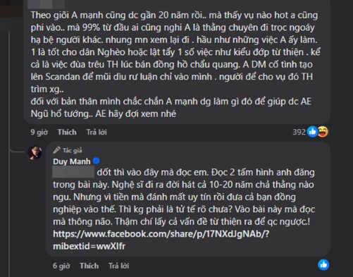 Dưới bình luận, khi bị chê trách việc “cà khịa” đồng nghiệp, Duy Mạnh tuyên bố: “Nghệ sĩ đi ra đời hát cả 10 – 20 năm chả thằng nào ngu. Nhưng vì tiền mà đánh mất uy tín rồi đưa cả bạn đồng nghiệp vào thế thì không phải là tử tế rõ chưa?”.