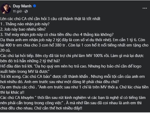 Tối 24/9, Duy Mạnh tiếp tục có chia sẻ gây chú ý về vấn đề này. Trên trang cá nhân, nam ca sĩ đặt ra loạt câu hỏi liên quan như: Ai là người nhận job? Job này bao nhiêu tiền và có ăn chia đều cho các thành viên trong nhóm hay không?