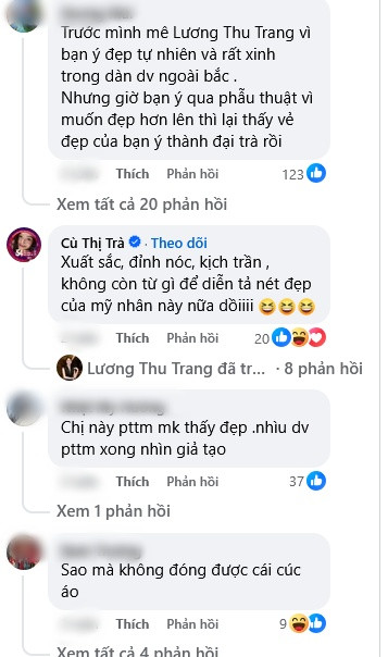 Khán giả cho rằng mỹ nhân VTV đã tiếp tục can thiệp thẩm mỹ để cải thiện nhan sắc ngày càng trẻ trung hơn. Tuy nhiên, dưới bài đăng, nhiều người để lại bình luận cảm thấy tiếc nuối cho nhan sắc trước kia của nữ diễn viên: “Trước mình mê Lương Thu Trang vì bạn ý đẹp tự nhiên và rất xinh trong dàn diễn viên ngoài Bắc, nhưng giờ bạn ý qua phẫu thuật vì muốn đẹp hơn lên thì lại thấy vẻ đẹp của bạn ý thành đại trà rồi”, “Giờ tác động nhiều thay đổi diện mạo không còn nét đẹp riêng, nhìn mấy người đó toàn hao hao giống nhau nhìn chán mắt”…