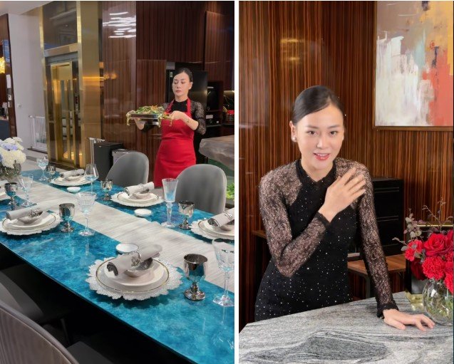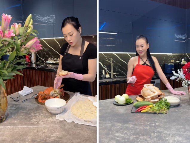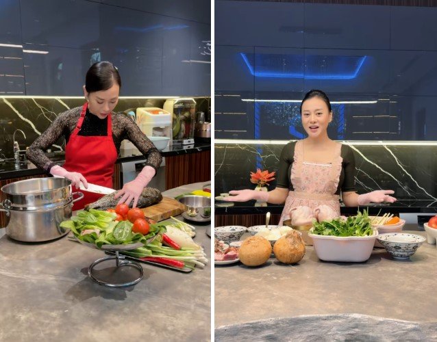 Hình ảnh cho thấy cô tự tay chuẩn bị từ nguyên liệu, sơ chế, nấu nướng cho đến dọn dẹp – chỉ thỉnh thoảng có người giúp việc phụ rửa chén. Không hề có bóng dáng một ê-kíp chuyên nghiệp nào như lời đồn.