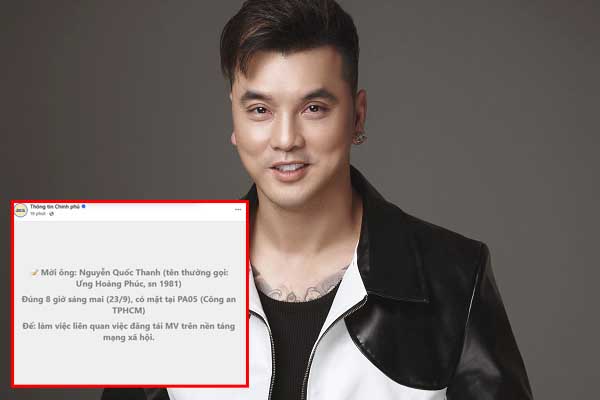Tối cùng ngày, trên fanpage Thông tin chính phủ cũng đăng bài viết mời ca sĩ Ưng Hoàng Phúc đến cơ quan có thẩm quyền làm việc với nội dung như sau: “Mời ông: Nguyễn Quốc Thanh (tên thường gọi: Ưng Hoàng Phúc, sn 1981). Đúng 8 giờ sáng mai (23/9), có mặt tại PA05 (Công an TPHCM). Để: làm việc liên quan việc đăng tải MV trên nền tảng mạng xã hội”.