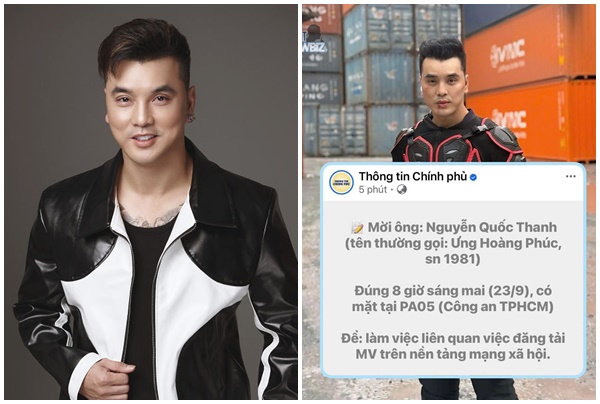 Tối cùng ngày, trên fanpage Thông tin chính phủ cũng đăng bài viết mời ca sĩ Ưng Hoàng Phúc đến cơ quan có thẩm quyền làm việc với nội dung như sau: “Mời ông: Nguyễn Quốc Thanh (tên thường gọi: Ưng Hoàng Phúc, sn 1981). Đúng 8 giờ sáng mai (23/9), có mặt tại PA05 (Công an TPHCM). Để: làm việc liên quan việc đăng tải MV trên nền tảng mạng xã hội”.