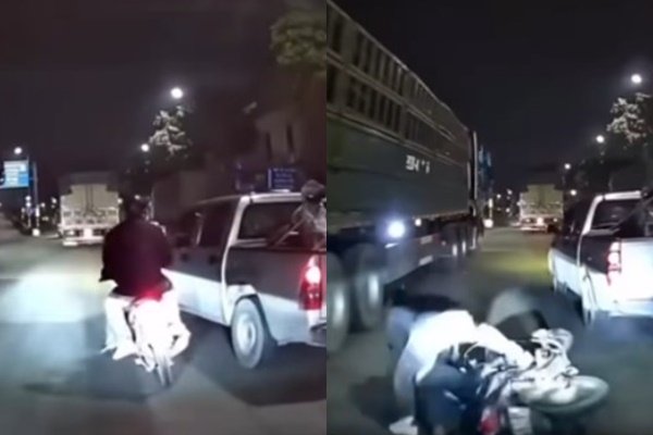 Như đã thông tin, đoạn clip lan truyền trên mạng xã hội ghi lại cảnh một xe bán tải đang lưu thông thì bất ngờ tạt đầu, chèn ép xe máy chở hai người lớn và một trẻ nhỏ. Cú tác động khiến xe máy đổ ra đường, các nạn nhân ngã xuống, suýt bị xe container chạy cùng chiều cuốn vào gầm. Rất may, tài xế container kịp xử lý, tránh được hậu quả đặc biệt nghiêm trọng.