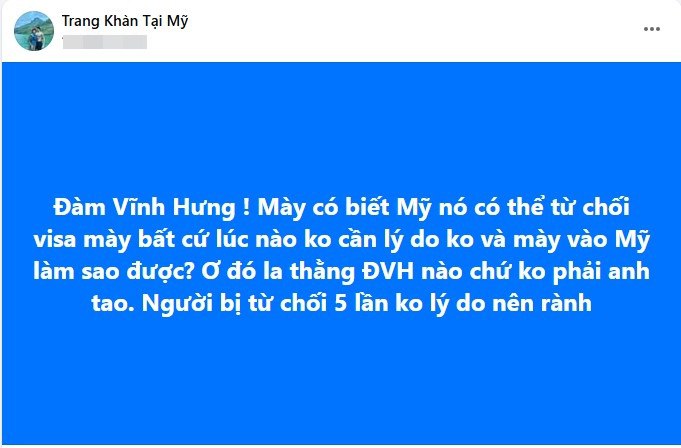 Hết chử:i bà Hằng, Trang Khàn lại bất ngờ gọi thẳng tên Đàm Vĩnh Hưng, xưng m:à:y t:ao rồi nói: ‘Mỹ từ chối visa của m mà không cần lí do, m không vào được Mỹ đâu’