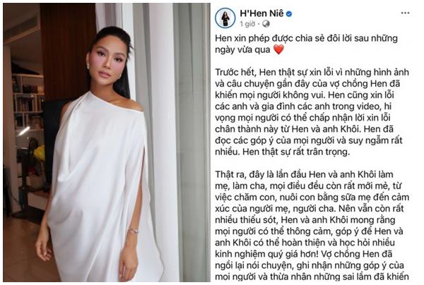 Trong bài đăng, H’Hen Niê thừa nhận dòng chia sẻ trước đó gây tranh luận của mình là chưa suy nghĩ thấu đáo, xuất phát từ tâm lý của một người vợ muốn bảo vệ chồng. “Anh Khôi không phải là người nổi tiếng, chưa quen với những áp lực. Hen mong mọi người có thể góp ý nhẹ nhàng hơn, để anh cố gắng hoàn thiện bản thân trong hành trình làm chồng, làm cha. Sau khi suy nghĩ chín chắn hơn, tôi xin lỗi vì đó là những phát ngôn chưa phù hợp và tôi không cổ vũ cho những điều không đúng”, cô chia sẻ.