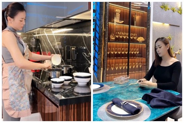 Đặc biệt, bộ sưu tập chén đĩa đồ sộ của Phương Oanh cũng gây chú ý không kém. Từ gốm sứ Âu viền vàng sang trọng, gốm Bát Tràng giả cổ cho tới đĩa gà men xanh lam cổ điển… mỗi bữa ăn, cô lại sử dụng một kiểu khác nhau, đến mức nhiều netizen đùa rằng “chụp ảnh 100 bữa cũng không trùng một chiếc đĩa nào”. Chính sự cầu toàn này góp phần biến không gian bếp trở thành nơi “đã nhìn là nhớ”.