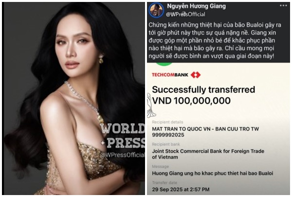 Mới đây, Hương Giang vừa bày tỏ cảm xúc xót xa khi chứng kiến những thiệt hại mà cơn bão gây ra với nhiều người. Đồng thời, nàng hậu cho biết đã gửi số tiền 100 triệu đồng đến Mặt trận Tổ quốc Việt Nam – Ban cứu trợ Trung ương nhằm góp phần ủng hộ người dân vượt qua khó khăn do bão số 10 gây ra.