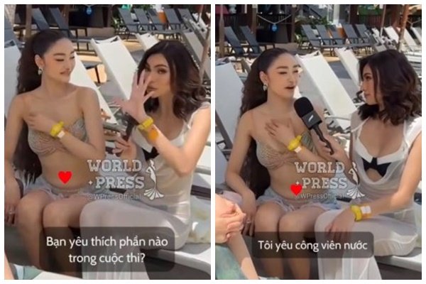 Theo đó, mạng xã hội lan truyền khoảnh khắc Yến Nhi đang ngồi chờ trong trang phục đồ tắm thì được Miss Grand Philippines – Emma Mary Tiglao tiến đến phỏng vấn bất ngờ.