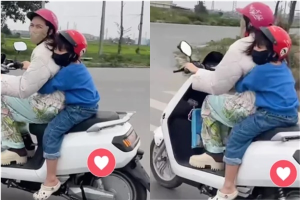 Hòa Minzy mặc đồ giản dị, lộ rõ niềm vui khi chở con bằng xe máy. Ảnh: FBNV