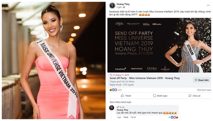 Cụ thể, người đẹp chia sẻ kỷ niệm buổi send-off của Miss Universe Vietnam năm 2019 cùng dòng trạng thái: “Facebook nhắc lại kỷ niệm 6 năm trước Miss Universe Vietnam 2019. Liệu trước khi lấy chồng, mình làm gì đó chấn động nhỉ? Nếu bạn trở thành Miss Universe hôm nay, bạn sẽ làm gì?”.