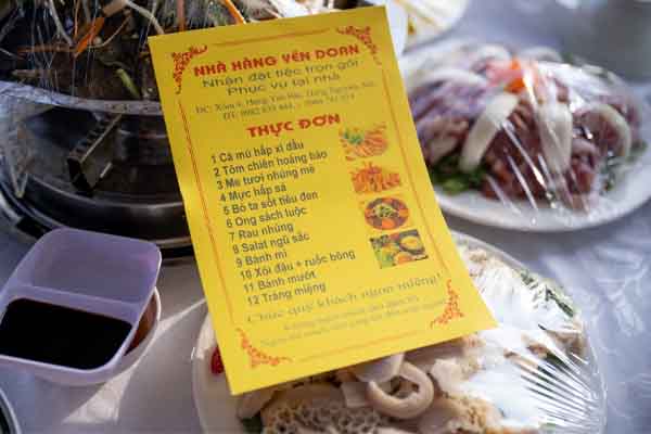 Thực đơn mâm cỗ được chuẩn bị chu đáo với 12 món, mang đậm hương vị ẩm thực xứ Nghệ. Trên các mâm cỗ là những món quen thuộc, như cá mú hấp xì dầu, tôm chiên hoàng bào, me tươi nhúng mẻ, mực hấp sả, bò ta sốt tiêu đen, lòng sách luộc, rau nhúng, salad ngũ sắc, bánh mì, xôi đậu ăn kèm ruốc bông, bánh mướt và món tráng miệng.