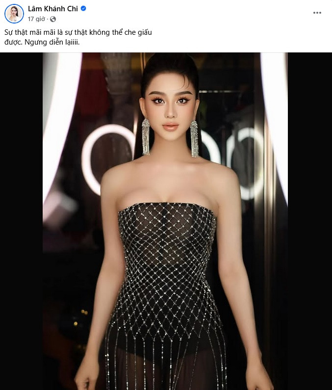 Đáng chú ý, mới đây, Lâm Khánh Chi cập nhật dòng trạng thái mới sau đám tang cố nghệ sĩ gây chú ý. Trên trang cá nhân, cô đăng ảnh và viết: “Sự thật mãi mãi là sự thật không thể che giấu được. Ngưng diễn lại.”