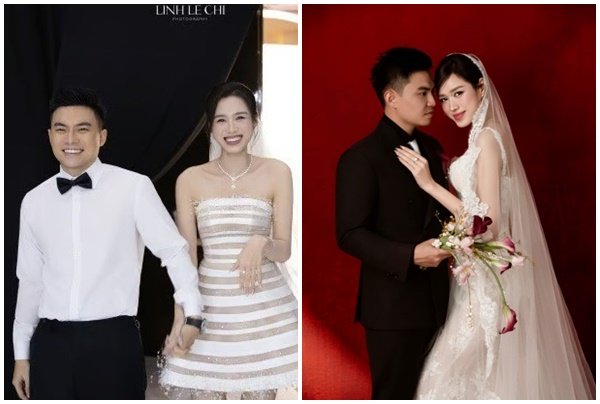 Không gian tiệc được trang trí sang trọng với gam trắng chủ đạo, phủ đầy hoa tươi và ánh sáng dịu, mang lại cảm giác tinh khôi, lãng mạn. Trong ngày trọng đại, Hoa hậu Việt Nam 2020 diện váy cưới ren ôm sát khoe vóc dáng thanh thoát, trong khi chồng thiếu gia chọn bộ suit trắng lịch lãm, sánh đôi cùng vợ trong khung cảnh như cổ tích.