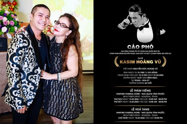 Tang lễ của Kasim Hoàng Vũ dự kiến diễn ra giản dị từ 10h đến 20h trong hai ngày 13–14/3 tại Nhà quàn Vĩnh Phước ở bang Texas, Mỹ. Lễ hỏa táng sẽ được tổ chức vào 15h ngày 15/3/2026 tại cùng địa điểm theo nguyện vọng của gia đình.
