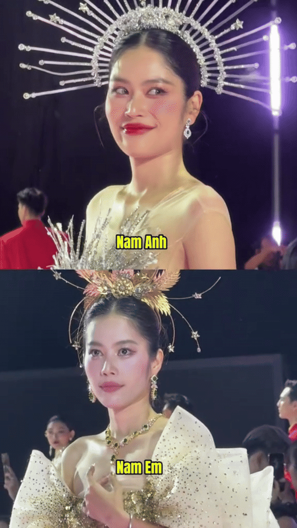 Tuy có ngoại hình tương đồng nhưng giữa cặp chị em cũng có nhiều khác biệt từ trang phục, makeup đến thần thái. Nam Anh sắc sảo với đôi mắt xám quyết liệt và son đỏ quyết rũ. Trong khi đó, Nam Em vốn có sự rực rỡ, kiêu sa từ bộ trang phục ánh vàng, cô được makeup nhẹ nhàng với đôi má cool tone nền nã.