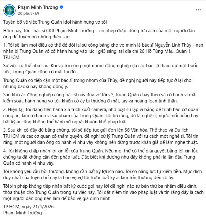 Mới đây,Chồng của nữ nạn nhân – bác sĩ Phạm Minh Trường đã chính thức đăng tải bài viết dài, tường trình cụ thể sự việc và cho biết vợ mình (bác sĩ Nguyễn Linh Thùy) bị Trung Quân Idol hành hung vào rạng sáng lúc 1h45 tại một buổi tiệc ở TP.HCM.