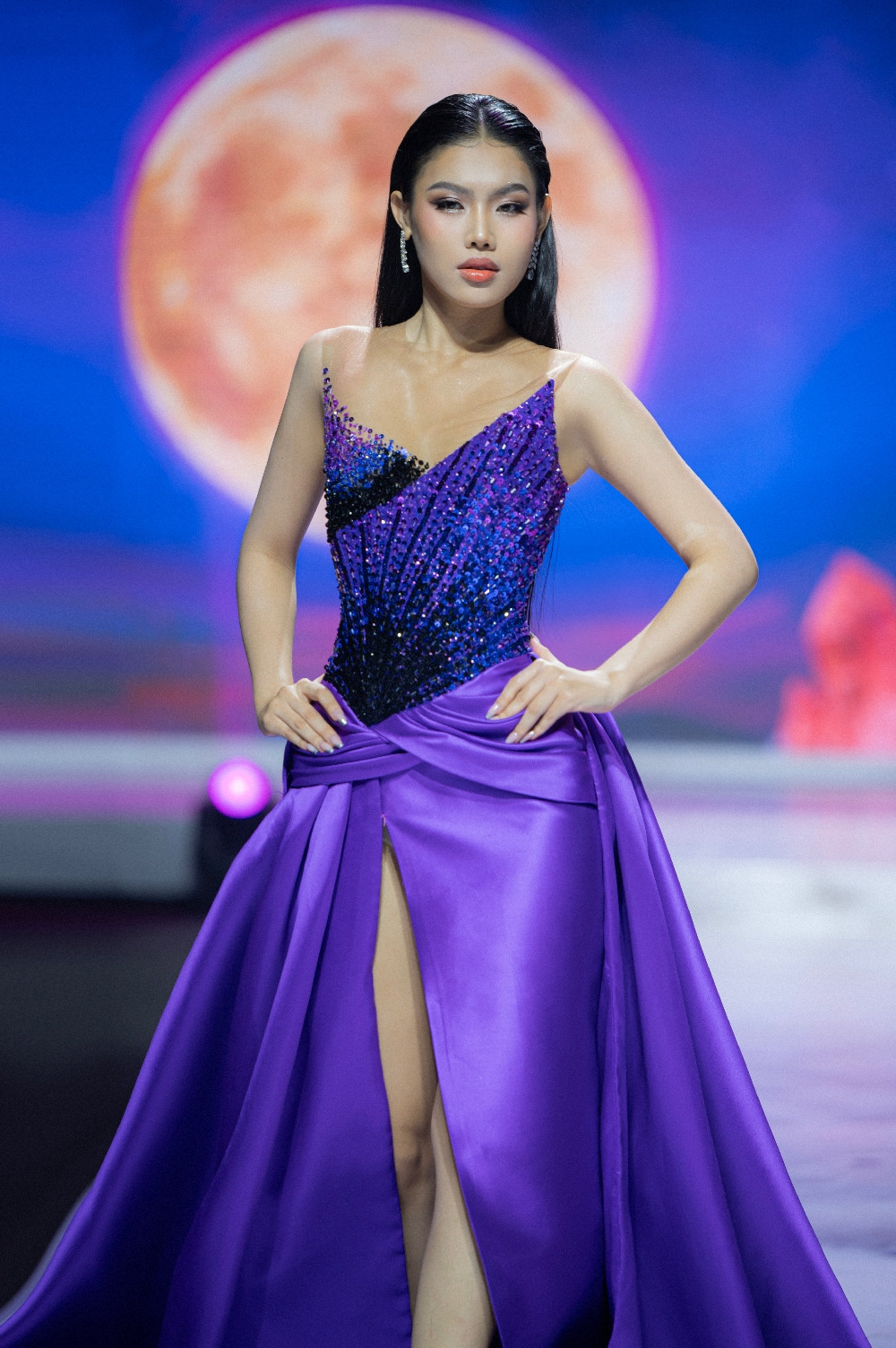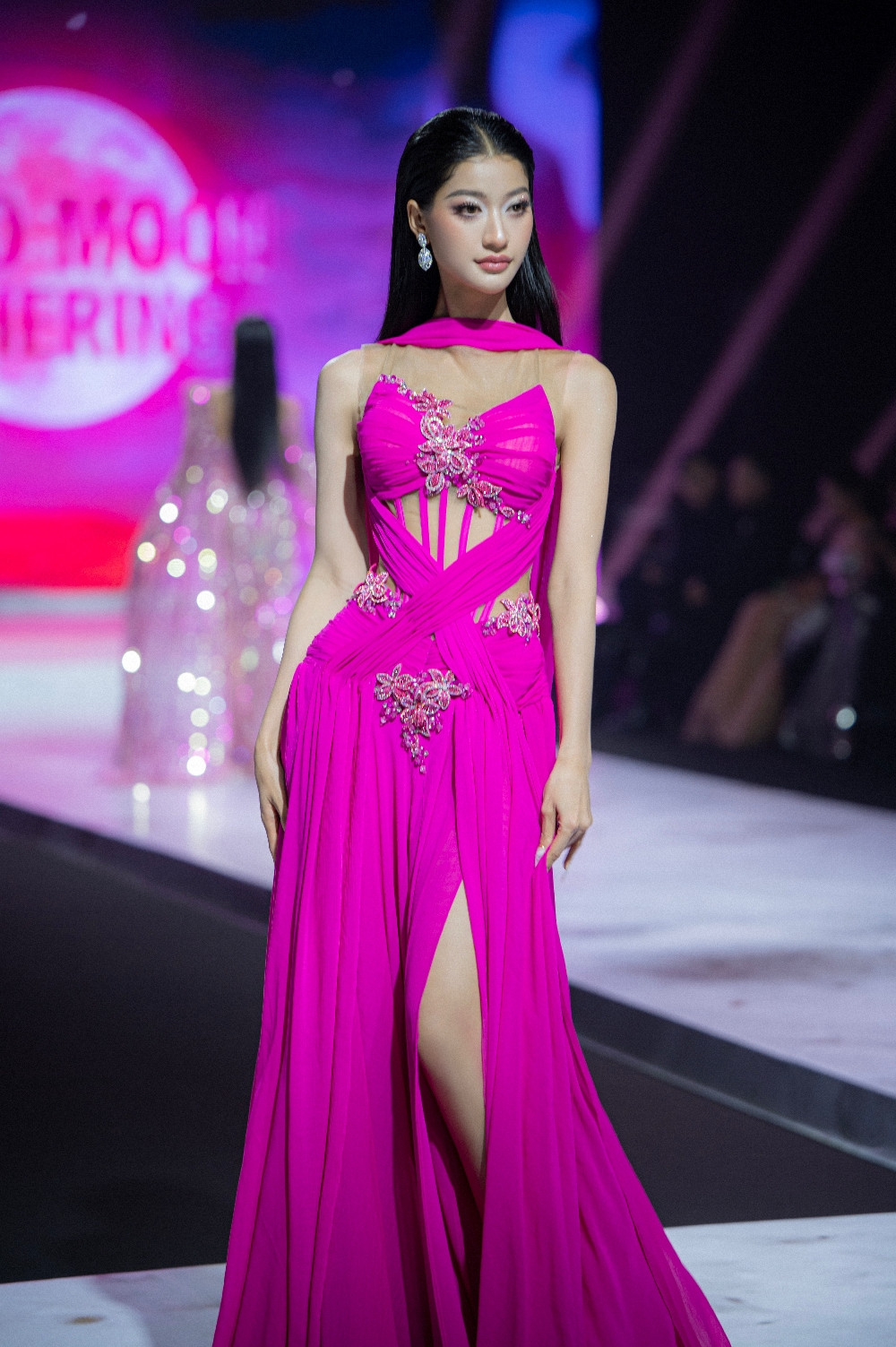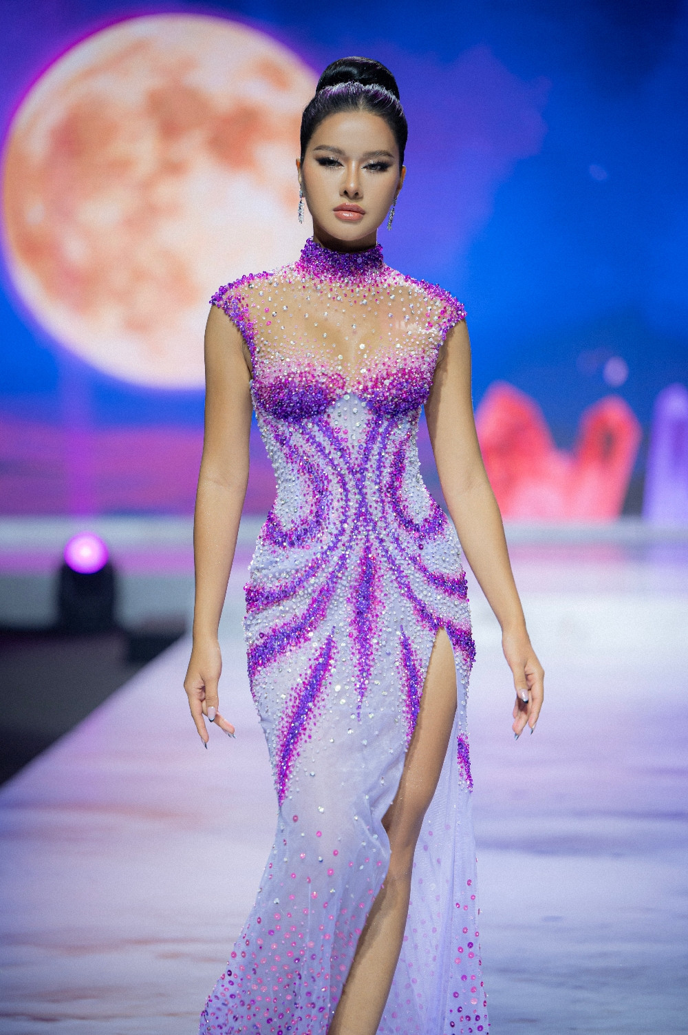Top 45 Hoa hậu Hoàn vũ Việt Nam 2025 xuất hiện trong những thiết kế của Lê Ngọc Lâm, Brian Võ, Khánh Vân & Lâm Lâm… BST The light beyond mở đầu lấy cảm hứng từ ánh sáng với các trang phục gam màu vàng đồng, ánh kim, trắng bạc, mang đường cắt mềm mại, phom dáng hiện đại. Hoa hậu Khánh Vân và đương kim Miss Cosmo Ketut Permata Juliastrid giữ vai trò vedette.