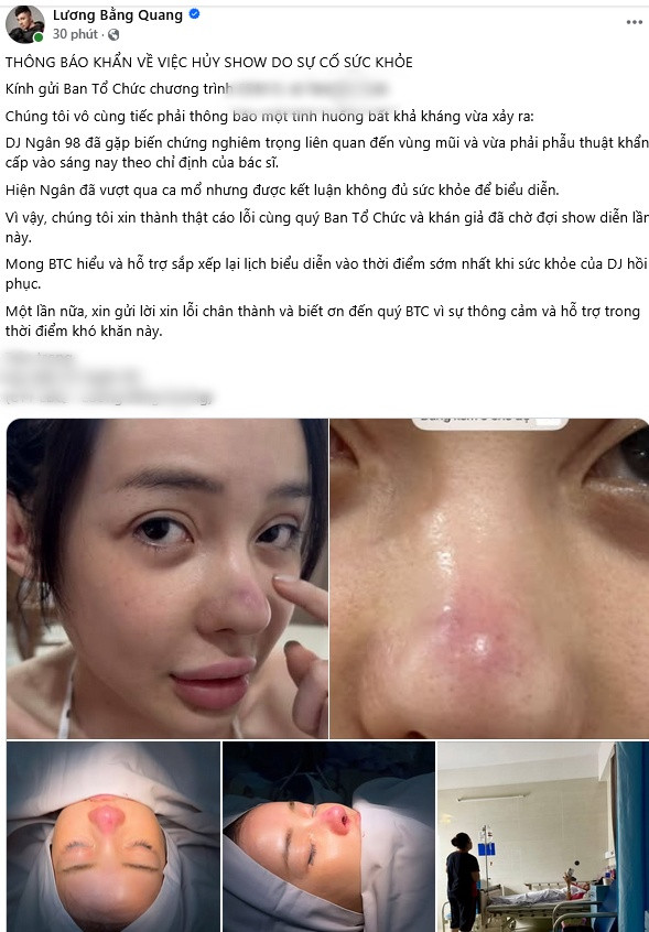 Ngân 98 thông báo khẩn hủy show vì biến chứng thẩm mỹ mũi nặng không thể biểu diễn.