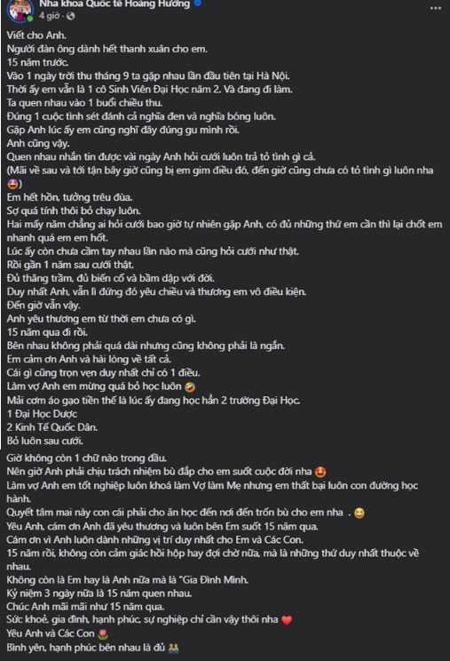 Mới đây, Hoàng Hường tiết lộ về cuộc hôn nhân với người chồng hoàn hảo trên mạng xã hội. Theo đó, nữ doanh nhân cho biết cả hai gặp nhau vào 15 năm trước, khi cô vẫn còn là sinh viên đại học năm 2. Chuyện tình của họ đến chớp nhoáng và điều gây choáng hơn nữa là chỉ vài ngày sau chồng Hoàng Hường đã ngỏ lời cầu hôn.