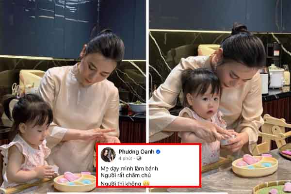 Hôm 15/4, Phương Oanh đăng khoảnh khắc cùng cặp song sinh Jimmy – Jenny cùng làm bánh trôi, bánh chay mừng Tết Hàn thực. Cô viết: “Mẹ dạy mình làm bánh. Người rất chăm chú. Người thì không”. Bài đăng của nữ diễn viên nhanh chóng thu hút sự quan tâm với hàng nghìn lượt “thích” cùng hàng trăm bình luận sau vài phút.