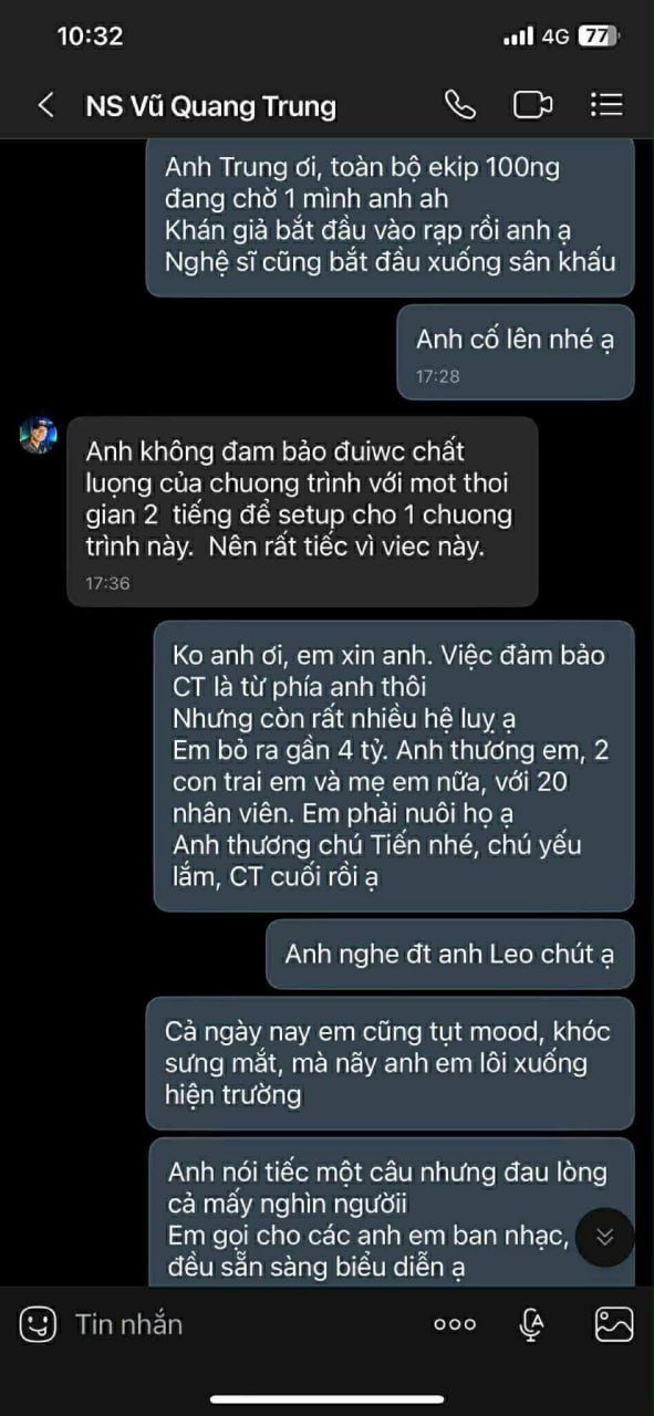 Mới đây, đoạn chat được cho là của chị Hà van xin nhạc sĩ Vũ Quang Trung được hé lộ: ‘Anh thương em, 2 con và mẹ em nữa, với 20 nhân viên em phải nuôi họ. Toàn bộ ekip 100 người đang chờ 1 mình anh…’