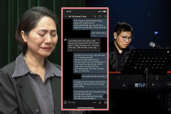 Mới đây, đoạn chat được cho là của chị Hà van xin nhạc sĩ Vũ Quang Trung được hé lộ: ‘Anh thương em, 2 con và mẹ em nữa, với 20 nhân viên em phải nuôi họ. Toàn bộ ekip 100 người đang chờ 1 mình anh…’