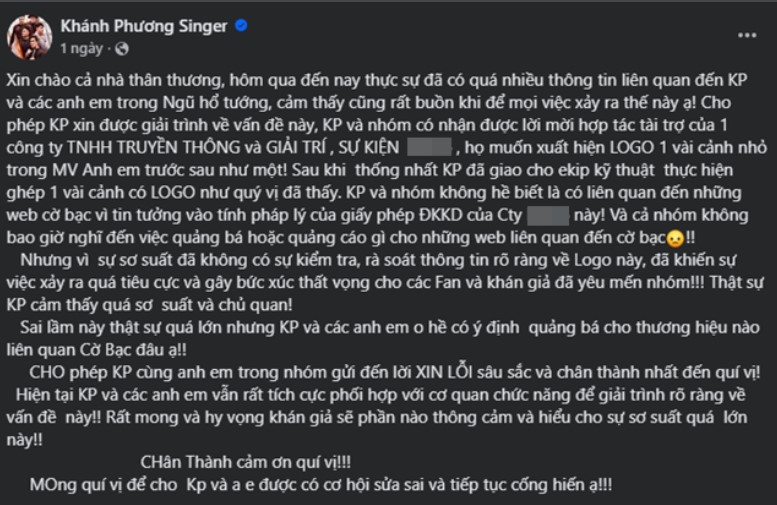 Trước đó, khi vụ việc trở nên rùm beng, Khánh Phương từng đăng bài giải thích trên trang cá nhân. Anh cho biết: “Khánh Phương và nhóm có nhận được lời mời hợp tác tài trợ của công ty TNHH Truyền thông và Giải trí, Sự kiện MB**, họ muốn xuất hiện logo vài cảnh nhỏ trong MV. Sau khi thống nhất, Khánh Phương đã giao cho ê-kíp kỹ thuật thực hiện ghép một vài cảnh có logo như quý vị đã thấy. Tôi và nhóm không hề biết là có liên quan đến những web cờ bạc vì tin tưởng vào tính pháp lý giấy phép đăng ký kinh doanh của công ty này. Cả nhóm không bao giờ nghĩ đến việc quảng bá hoặc quảng cáo cho những web liên quan đến cờ bạc”.