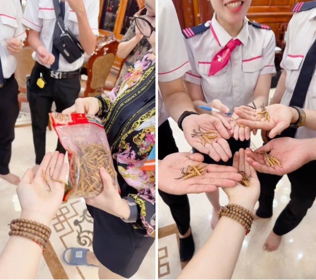 Mailisa cầm gói Đông trùng hạ thảo lớn để phát cho từng nhân viên và họ bày tỏ rất hào hứng nhận phần của mình. Ban đầu, mỗi người được nhận hai con những khi thấy lượng đó quá ít, Mailisa đã vui vẻ phát thêm. Không chỉ vậy, khi một nhân viên hài hước nói sức khỏe yếu, lập tức Mailisa liền cho hẳn 5 con Đông trùng hạ thảo để bồi bổ.