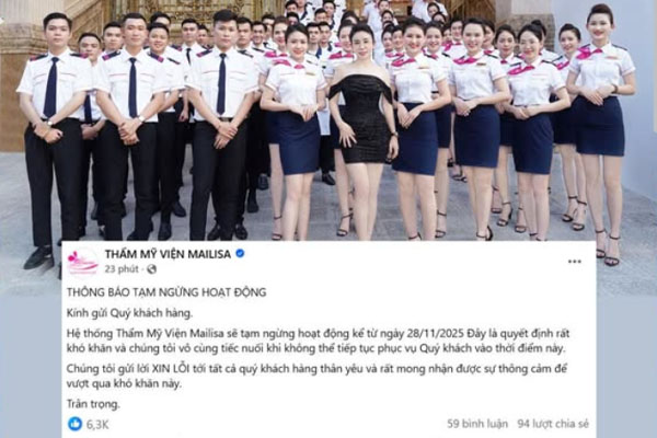 Tối 27/11/2025, trên fanpage chính thức, hệ thống Mailisa phát đi thông báo sẽ tạm ngừng hoạt động toàn hệ thống từ ngày 28/11/2025. Trong thông báo, đơn vị này mô tả quyết định là “rất khó khăn”, đồng thời gửi lời xin lỗi tới khách hàng và mong nhận được sự thông cảm. Thông báo được đưa ra trong thời điểm hệ thống thẩm mỹ này đang liên quan đến vụ án buôn lậu mỹ phẩm.